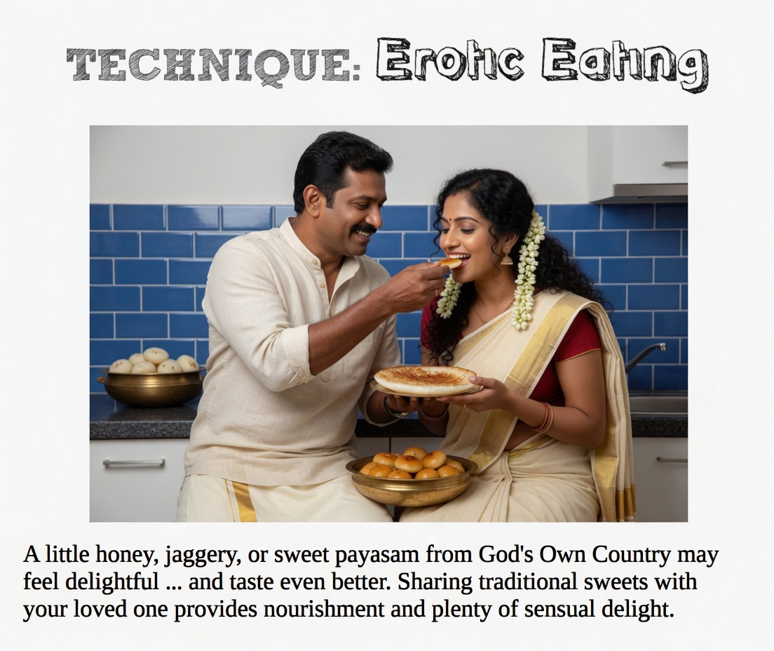 ദാമ്പത്യ ജീവിതത്തിലെ വിരസത മാറ്റാനും പങ്കാളികൾ തമ്മിലുള്ള അടുപ്പം വർദ്ധിപ്പിക്കാനും സഹായിക്കുന്ന രസകരമായ ഒരു രീതിയാണ് “എറോട്ടിക് ഈറ്റിംഗ്”. ലളിതമായി പറഞ്ഞാൽ, ഭക്ഷണവും രുചിയും ലൈംഗിക ഉത്തേജനത്തിനായി ഉപയോഗിക്കുന്ന കലയാണിത്. ഇത് ഇന്ദ്രിയങ്ങളെ ഉണർത്തുകയും ബന്ധത്തിൽ പുതിയൊരു തലം കൊണ്ടുവരികയും ചെയ്യുന്നു.