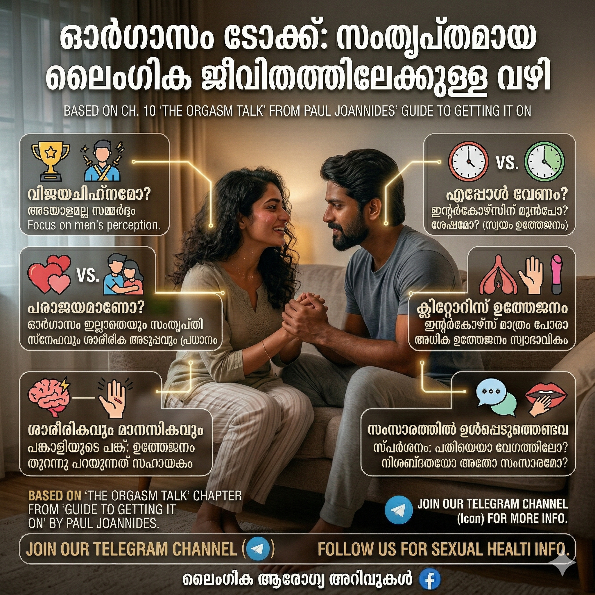 പോൾ ജോഅനൈഡ്‌സിന്റെ ‘ഗൈഡ് ടു ഗെറ്റിംഗ് ഇറ്റ് ഓൺ’ എന്ന പുസ്തകത്തിലെ ‘ഓർഗാസം സംസാരം’ (The Orgasm Talk) എന്ന പത്താം അധ്യായത്തെ ആസ്പദമാക്കി തയ്യാറാക്കിയ ലേഖനം താഴെ നൽകുന്നു. പങ്കാളികൾക്കിടയിൽ ലൈംഗിക സംതൃപ്തിയെക്കുറിച്ച് തുറന്ന ചർച്ചകൾ നടക്കേണ്ടതിന്റെ പ്രാധാന്യത്തെക്കുറിച്ചാണ് ഇത് പ്രതിപാദിക്കുന്നത്.