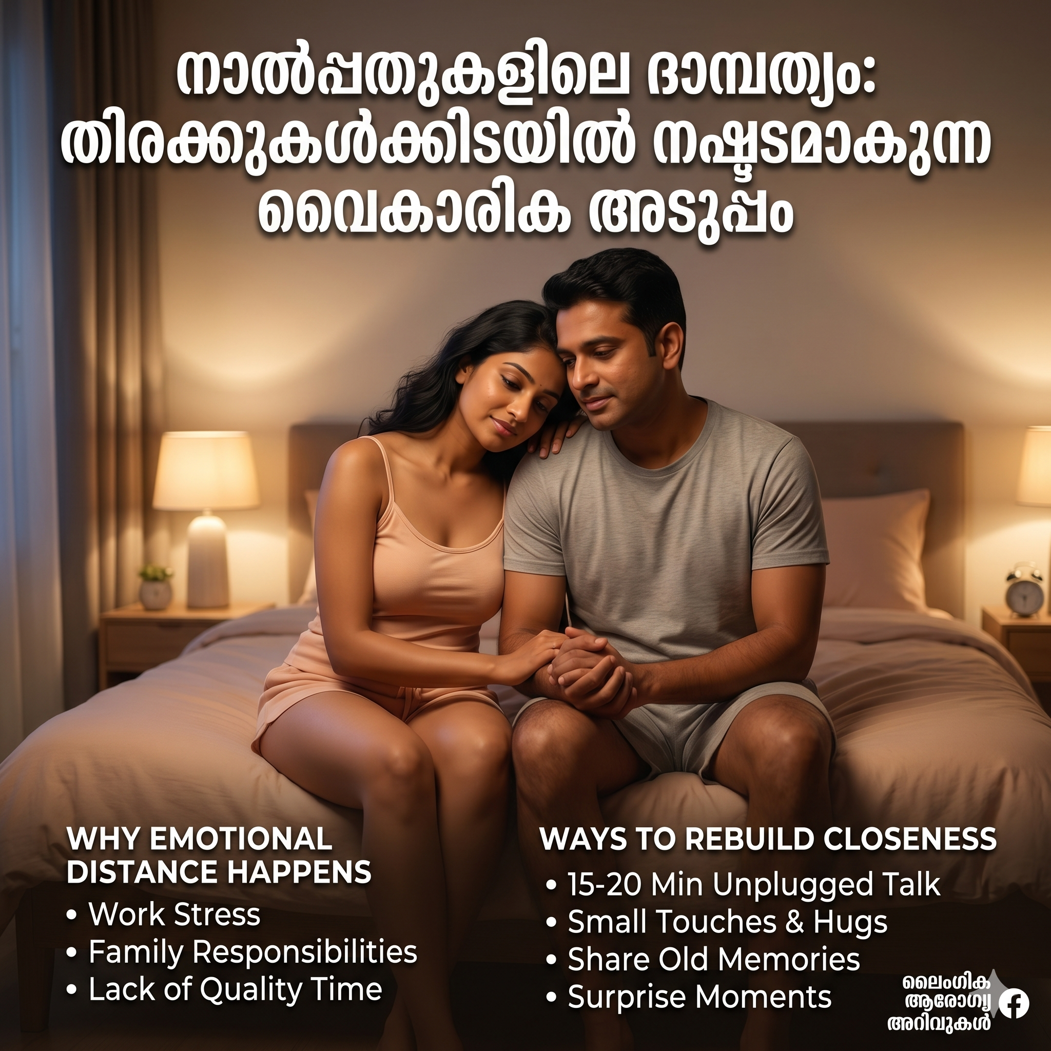 വിവാഹം കഴിഞ്ഞ് വർഷങ്ങൾ പിന്നിടുമ്പോൾ, പ്രത്യേകിച്ച് നാൽപ്പതുകളിൽ, ദമ്പതികൾക്കിടയിലെ സംഭാഷണങ്ങൾ പലപ്പോഴും വെറും ‘ചുമതലകളെ’ കുറിച്ചുള്ളവ മാത്രമായി ചുരുങ്ങാറുണ്ട്. കുട്ടികളുടെ പഠനം, കരിയറിലെ വെല്ലുവിളികൾ, പ്രായമായ മാതാപിതാക്കളുടെ സംരക്ഷണം എന്നിവയ്ക്കിടയിൽ സ്വന്തം പങ്കാളിയെയും അവരുടെ മനസ്സിനെയും ശ്രദ്ധിക്കാൻ നമ്മൾ മറന്നുപോകുന്നു.