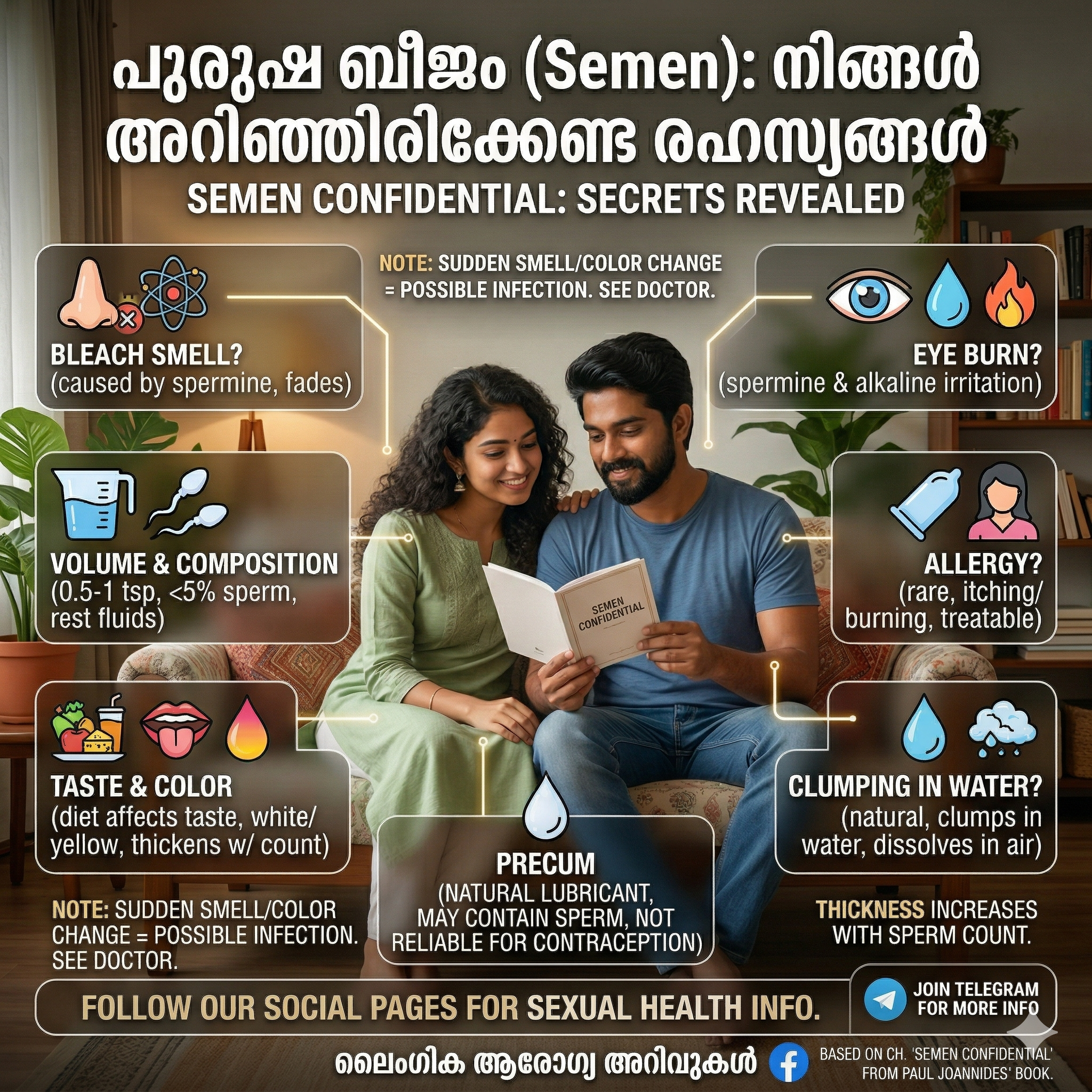 ശ്രദ്ധിക്കുക: ബീജത്തിന്റെ ഗന്ധത്തിൽ പെട്ടെന്ന് വലിയ മാറ്റം വരികയോ, അമിതമായ മഞ്ഞ നിറം കാണപ്പെടുകയോ ചെയ്താൽ അത് അണുബാധയുടെ (Infection) ലക്ഷണമാകാം. ഇത്തരം സാഹചര്യങ്ങളിൽ ഒരു ഡോക്ടറെ കാണുന്നത് നല്ലതാണ്.