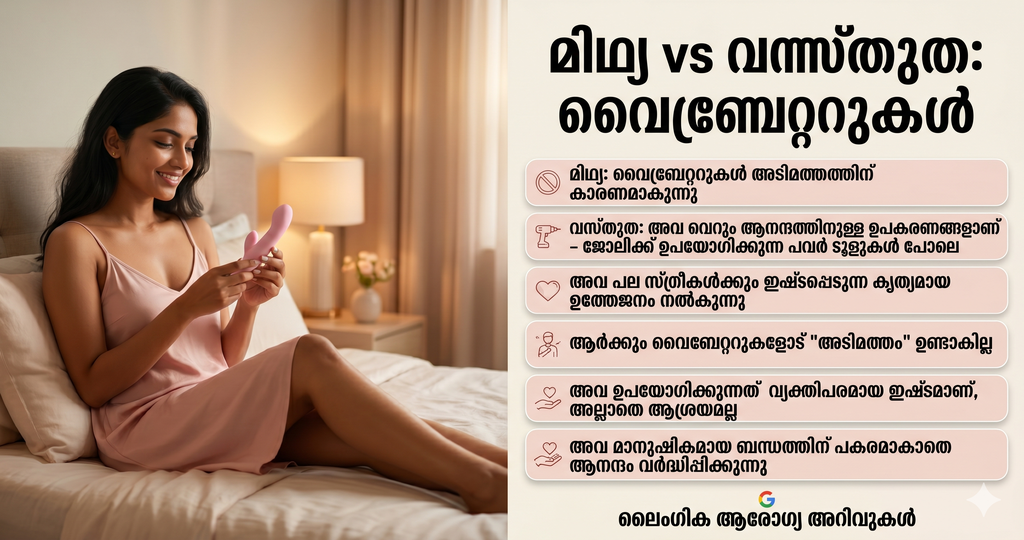 ഇതുപോലെ തന്നെയാണ് വൈബ്രേറ്ററുകളും. പല സ്ത്രീകൾക്കും വൈബ്രേറ്ററുകൾ പ്രിയപ്പെട്ടതാകുന്നത് അത് നൽകുന്ന കൃത്യമായ ഉത്തേജനം കൊണ്ടാണ്. ഇത് കേവലം ഒരാളുടെ വ്യക്തിപരമായ താല്പര്യം (Personal Preference) മാത്രമാണ്, അല്ലാതെ ലഹരി പോലെ അടിമപ്പെടുന്ന ഒന്നല്ല.