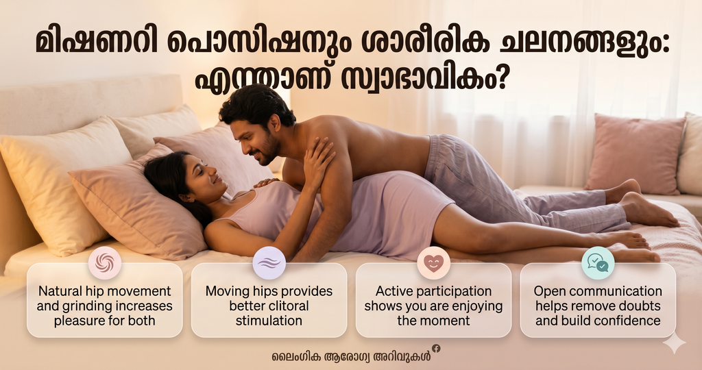 ലൈംഗികബന്ധത്തിനിടെ പങ്കാളിയിൽ നിന്നുണ്ടാകുന്ന ചില കമന്റുകൾ പലപ്പോഴും നമ്മളെ ചിന്തിപ്പിക്കാറുണ്ട്. പ്രത്യേകിച്ച് മിഷണറി പൊസിഷനിൽ (സ്ത്രീ താഴെയും പുരുഷൻ മുകളിലും വരുന്ന രീതി) സ്ത്രീകൾ ചലിക്കുന്നത് അസ്വാഭാവികമാണോ എന്ന സംശയം പലരിലും കാണാറുണ്ട്. ഇതിന്റെ സത്യാവസ്ഥയും ശാസ്ത്രീയ വശങ്ങളും പരിശോധിക്കാം.