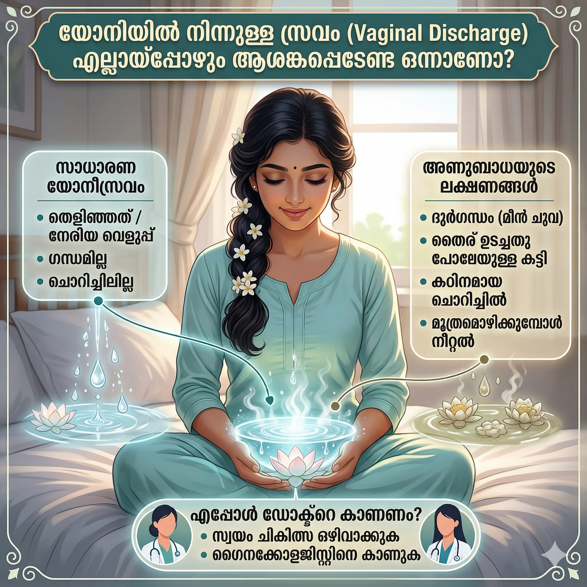 മേൽപ്പറഞ്ഞ ലക്ഷണങ്ങളിൽ ഏതെങ്കിലും നിങ്ങൾ അനുഭവിക്കുന്നുണ്ടെങ്കിൽ സ്വയം ചികിത്സയ്ക്ക് മുതിരാതെ ഒരു ഡോക്ടറെയോ ഗൈനക്കോളജിസ്റ്റിനെയോ കാണുക. കൃത്യമായ പരിശോധനയിലൂടെ അണുബാധയുടെ കാരണം കണ്ടെത്താനും ശരിയായ ചികിത്സ ഉറപ്പാക്കാനും ഇത് സഹായിക്കും.