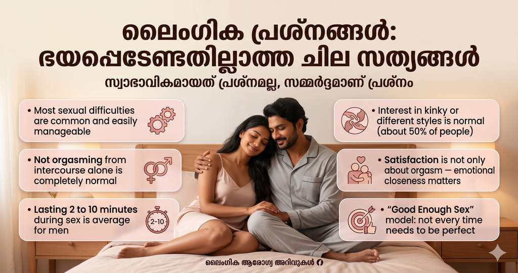 ലൈംഗിക ജീവിതത്തിൽ എന്തെങ്കിലും ബുദ്ധിമുട്ടുകൾ നേരിടുന്നത് ലോകാവസാനമല്ല. മിക്ക ആളുകളും തങ്ങളുടെ ജീവിതത്തിന്റെ ഏതെങ്കിലും ഒരു ഘട്ടത്തിൽ ഇത്തരം വെല്ലുവിളികൾ നേരിടാറുണ്ട്. എന്നാൽ സന്തോഷകരമായ വാർത്ത എന്തെന്നാൽ, മിക്ക ലൈംഗിക പ്രശ്നങ്ങളും ശരിയായ അറിവിലൂടെയും ലളിതമായ മാറ്റങ്ങളിലൂടെയും എളുപ്പത്തിൽ പരിഹരിക്കാവുന്നതാണ്.