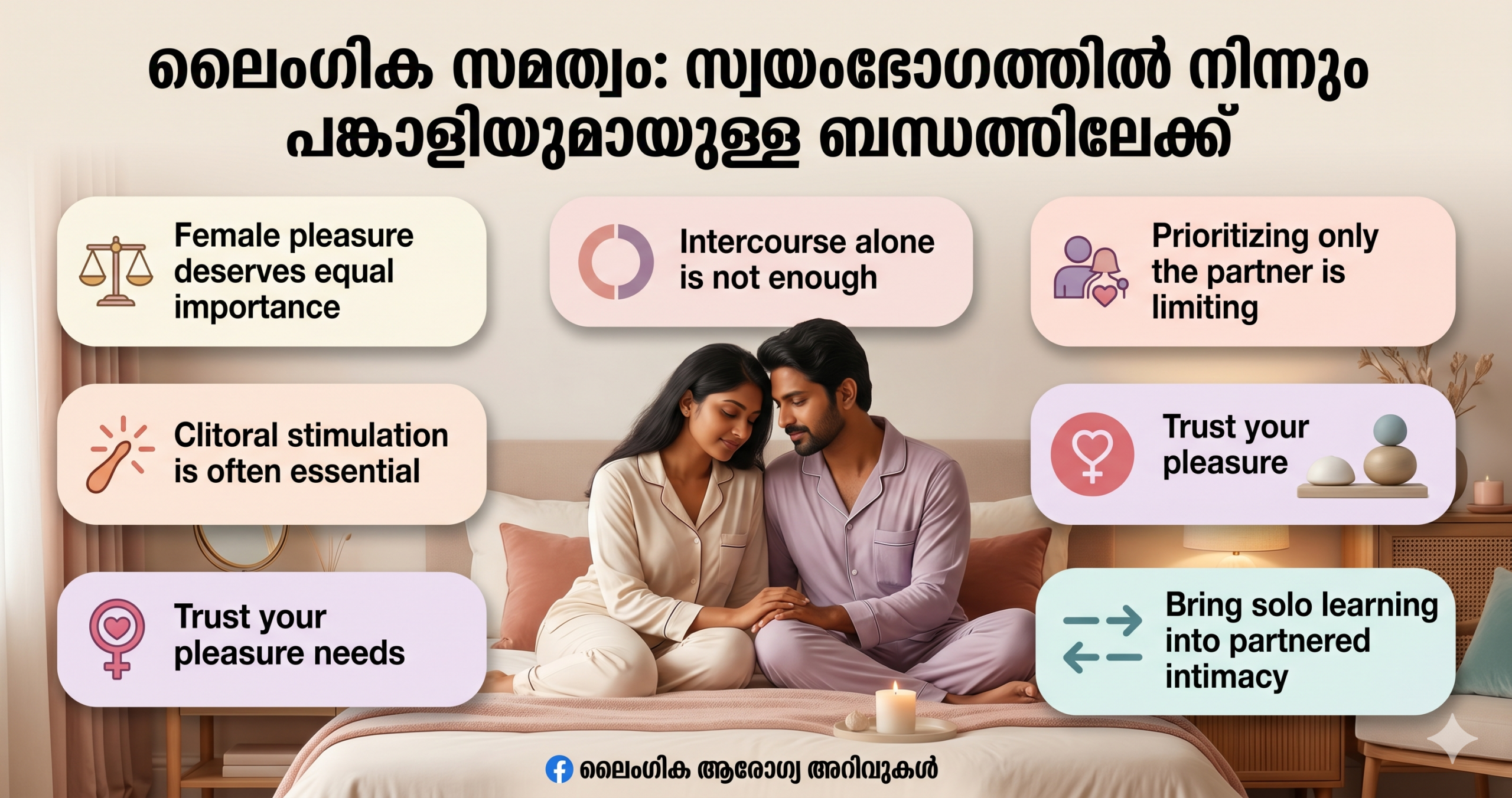 നമ്മുടെ സമൂഹത്തിൽ ലൈംഗികതയെക്കുറിച്ചുള്ള പൊതുവായ ധാരണ പലപ്പോഴും പുരുഷകേന്ദ്രീകൃതമാണ്. മുന്നൊരുക്കങ്ങൾ (Foreplay), അതിനുശേഷം യോനീബന്ധം (Intercourse), പുരുഷന്റെ ഓർഗാസത്തോടെ എല്ലാം അവസാനിക്കുന്നു—ഇതാണ് ഇന്നും നിലനിൽക്കുന്ന രീതി. എന്നാൽ ഈ രീതിയിൽ സ്ത്രീകളുടെ ലൈംഗിക സംതൃപ്തിക്ക് (Female Orgasm) വളരെ കുറഞ്ഞ സാധ്യത മാത്രമേയുള്ളൂ എന്ന് നാം തിരിച്ചറിയണം.