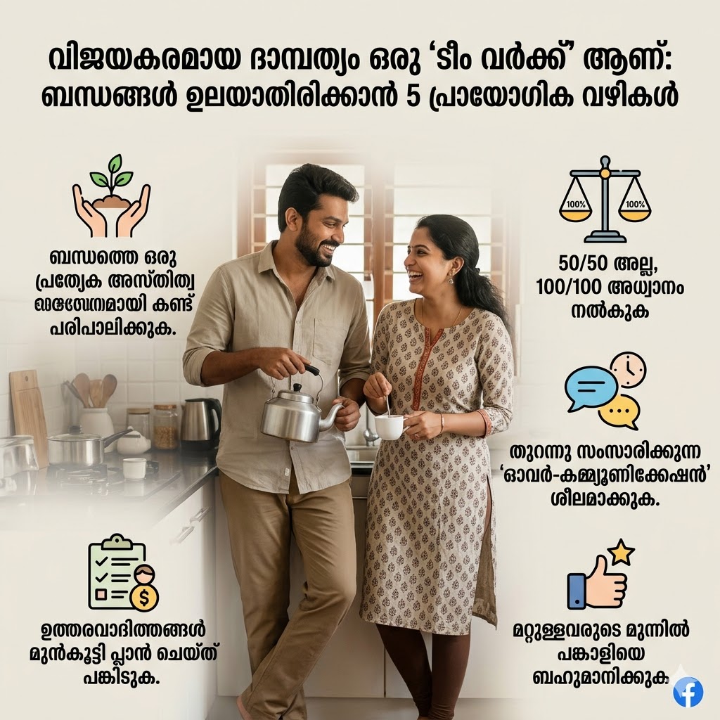 വിവാഹം എന്നത് കേവലം രണ്ട് വ്യക്തികൾ ഒന്നിച്ചു ജീവിക്കുന്ന ഒന്നല്ല, മറിച്ച് അതൊരു വലിയ ഉത്തരവാദിത്തമാണ്. പലപ്പോഴും തുടക്കത്തിലെ ആവേശം കുറയുമ്പോൾ ദമ്പതികൾക്കിടയിൽ അകൽച്ച വരാറുണ്ട്. ലോകമെമ്പാടുമുള്ള ദശലക്ഷക്കണക്കിന് ദമ്പതികളുടെ അനുഭവങ്ങളിൽ നിന്ന് രൂപപ്പെടുത്തിയ, ദാമ്പത്യം ദൃഢമാക്കാനുള്ള ചില സുപ്രധാന വഴികൾ താഴെ പറയുന്നവയാണ്.
