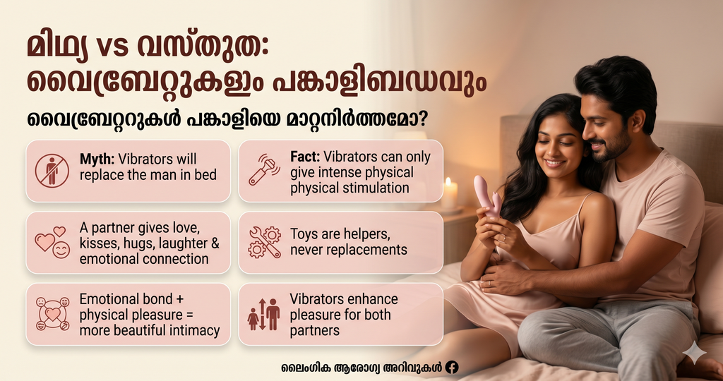 വൈബ്രേറ്ററുകൾ ഒരിക്കലും പുരുഷന് പകരമാകില്ല. അവ കേവലം ഒരു സഹായി മാത്രമാണ്. നിങ്ങളുടെ പങ്കാളിയുമായുള്ള വൈകാരിക ബന്ധവും സ്നേഹവുമാണ് ലൈംഗികതയുടെ അടിത്തറ. അതിൽ തീവ്രമായ ശാരീരിക സുഖം കൂടി ഉറപ്പാക്കാൻ വൈബ്രേറ്ററുകൾ സഹായിക്കുന്നു എന്ന് മാത്രം.