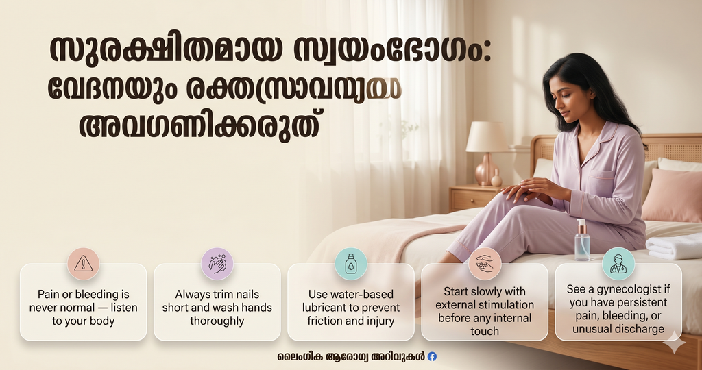 ശുചിത്വം: സ്വയംഭോഗത്തിന് മുൻപ് കൈകൾ സോപ്പിട്ട് നന്നായി കഴുകുക. നഖങ്ങൾ വെട്ടി വൃത്തിയാക്കി നിർത്തുക.