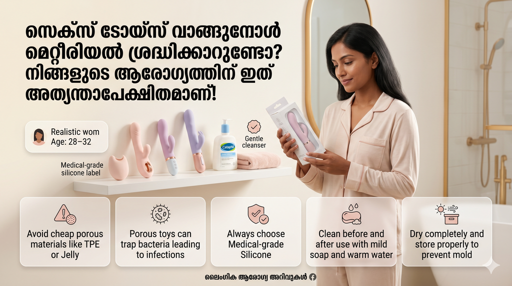 മെഡിക്കൽ ഗ്രേഡ് സിലിക്കൺ (Medical-grade Silicone): ടോയ്സുകൾ വാങ്ങുമ്പോൾ എപ്പോഴും മെഡിക്കൽ ഗ്രേഡ് സിലിക്കൺ കൊണ്ടുണ്ടാക്കിയവ തിരഞ്ഞെടുക്കുക. ഇവയിൽ സുഷിരങ്ങൾ ഇല്ലാത്തതിനാൽ ബാക്ടീരിയകൾ തങ്ങിനിൽക്കില്ല.
