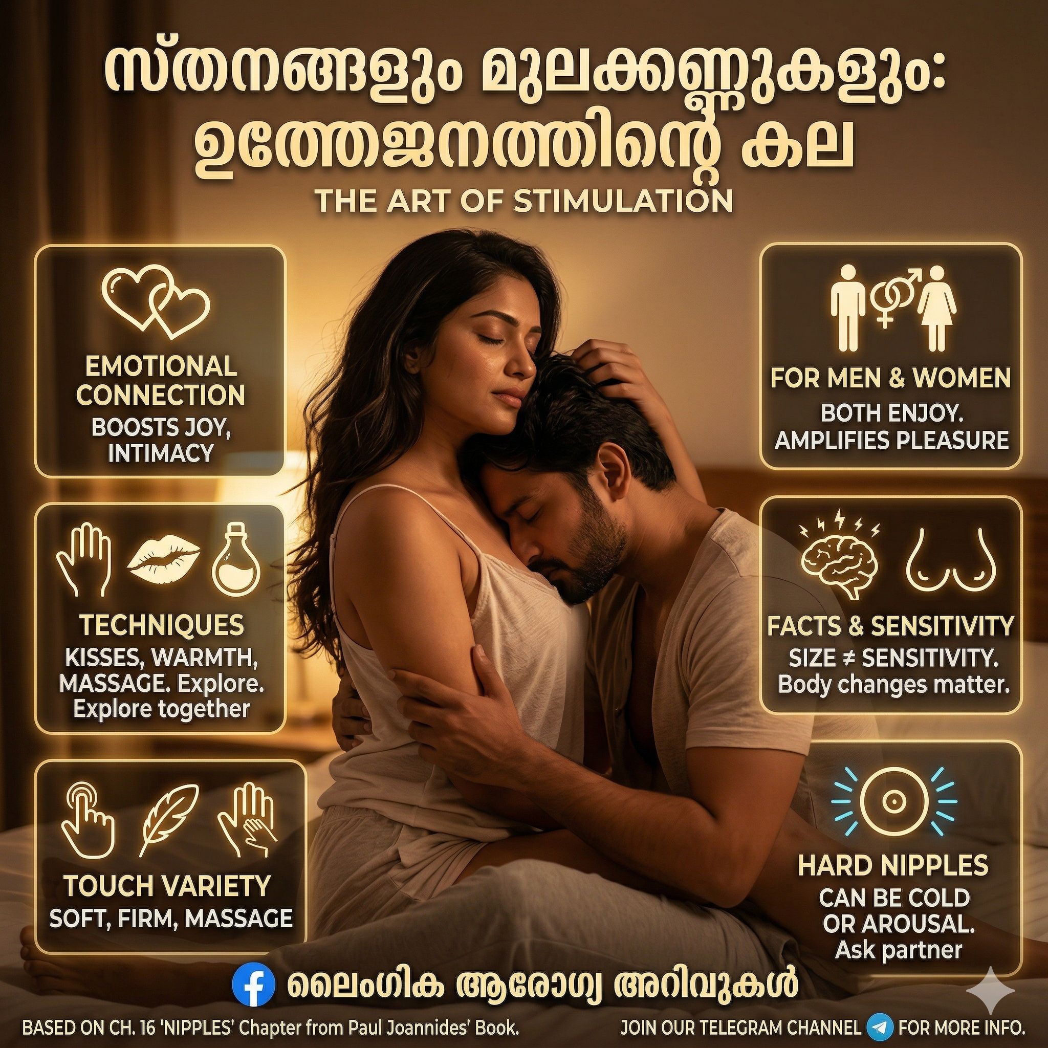 ചുരുക്കത്തിൽ: സ്തനങ്ങളും മുലക്കണ്ണുകളും ശരീരത്തിലെ അതീവ സംവേദനക്ഷമതയുള്ള ഭാഗങ്ങളാണ്. അവയെ സ്നേഹത്തോടെയും കരുതലോടെയും സമീപിക്കുന്നത് പങ്കാളികൾ തമ്മിലുള്ള അടുപ്പം വർദ്ധിപ്പിക്കാൻ സഹായിക്കും. നിങ്ങളുടെ പങ്കാളിക്ക് എങ്ങനെയുള്ള സ്പർശനമാണ് ഇഷ്ടമെന്ന് മനസ്സിലാക്കി അത് പരീക്ഷിക്കുന്നത് മികച്ച ലൈംഗിക ജീവിതത്തിന് അനിവാര്യമാണ്.