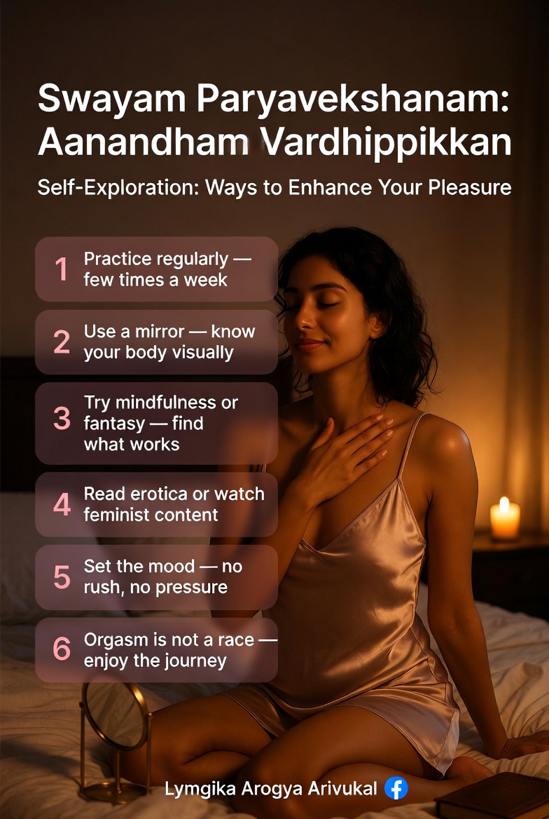 ആഴ്ചയിൽ കുറച്ചു തവണയെങ്കിലും നിങ്ങൾക്കായി സമയം മാറ്റിവെക്കുക. നിങ്ങളുടെ ശരീരത്തോട് നിങ്ങൾക്ക് എത്രത്തോളം അടുപ്പം തോന്നുന്നുവോ, അത്രത്തോളം ആത്മവിശ്വാസം നിങ്ങൾക്ക് ലഭിക്കും. ഓർഗാസം എന്നത് ഒരു മത്സരമല്ല, മറിച്ച് നിങ്ങളുടെ ശരീരം നൽകുന്ന സ്വാഭാവികമായ പ്രതികരണമാണ്. അതിനായി അമിതമായി സമ്മർദ്ദം ചെലുത്താതെ ആ നിമിഷം ആസ്വദിക്കാൻ ശ്രമിക്കുക.