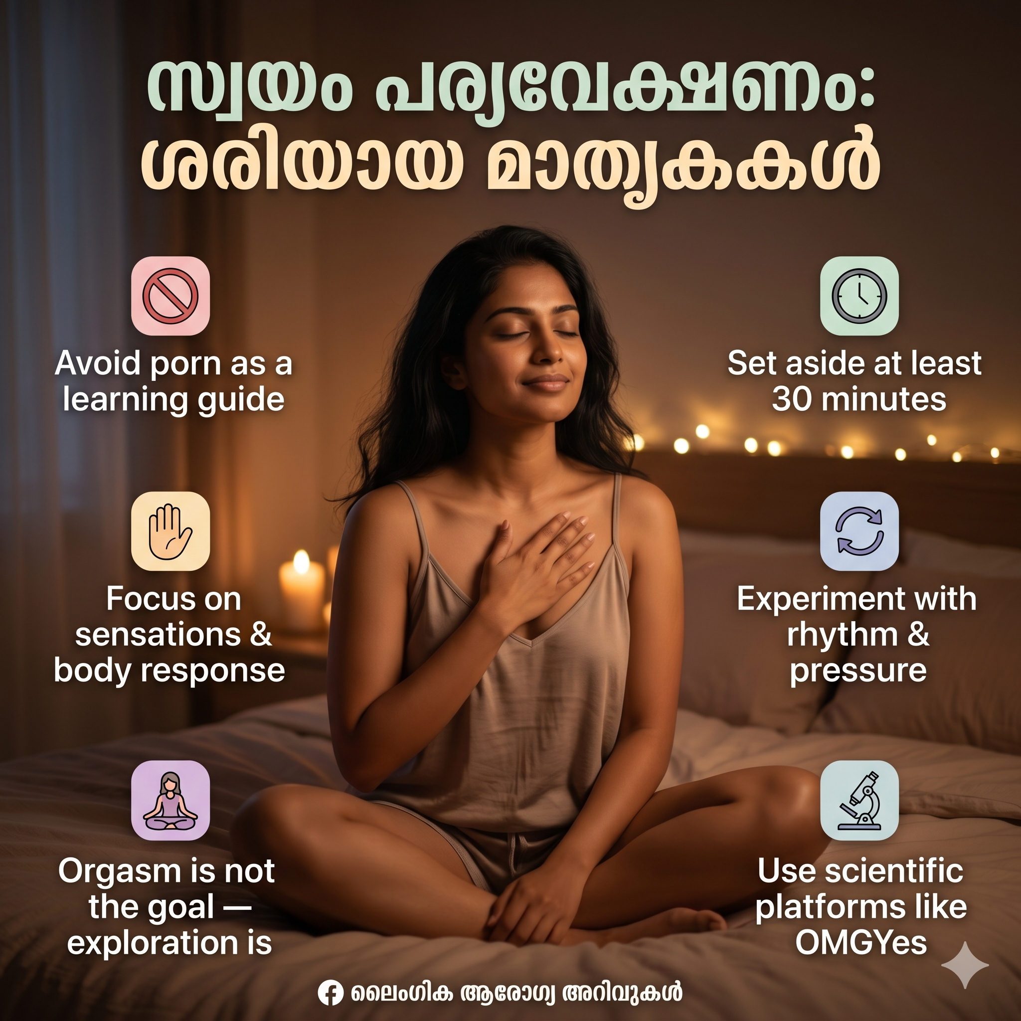 മാറ്റങ്ങൾ പരീക്ഷിക്കുക: ഒരേ താളത്തിൽ തന്നെ തുടരണമെന്നില്ല. സ്പർശനത്തിന്റെ വേഗതയോ അമർത്തുന്ന രീതിയോ (Pressure) മാറ്റി പരീക്ഷിക്കാം. നിങ്ങളുടെ ശരീരം എന്താണ് ആവശ്യപ്പെടുന്നത് എന്ന് മനസ്സിലാക്കാൻ ശ്രമിക്കുക.