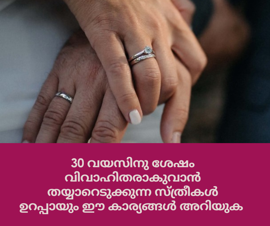 30 വയസ്സിനു ശേഷം വിവാഹം കഴിക്കുന്നത് സ്ത്രീകൾക്ക് അതുല്യമായ അവസരങ്ങളും വെല്ലുവിളികളും നൽകും. സ്വയം പ്രതിഫലനം, സാമ്പത്തിക സ്ഥിരത, ആശയവിനിമയ വൈദഗ്ധ്യം, പിന്തുണാ ശൃംഖലകൾ, വ്യക്തിഗത വളർച്ച, കുടുംബാസൂത്രണം തുടങ്ങിയ പ്രധാന വശങ്ങൾ ശ്രദ്ധിച്ചാൽ, സ്ത്രീകൾക്ക് വിജയകരവും സംതൃപ്തവുമായ വിവാഹ യാത്ര ആരംഭിക്കാൻ കഴിയും. സ്നേഹം, വിശ്വാസം, ധാരണ എന്നിവയിൽ അധിഷ്ഠിതമായ ഒരു പങ്കാളിത്തമാണ് വിവാഹം എന്ന് ഓർക്കുക, ഈ പ്രധാന പരിഗണനകൾക്ക് മുൻഗണന നൽകുന്നതിലൂടെ, നിങ്ങൾക്ക് സന്തോഷകരവും യോജിപ്പുള്ളതുമായ ഒരു ഐക്യത്തിന് ശക്തമായ അടിത്തറ സ്ഥാപിക്കാൻ കഴിയും.