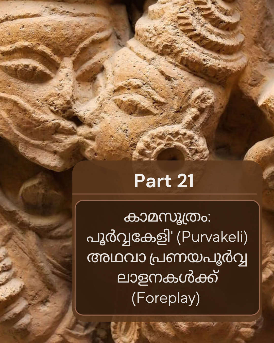 ഉപസംഹാരം: കാമസൂത്രത്തിലെ പൂർവ്വകേളി എന്നത് ലൈംഗികബന്ധത്തിന് തൊട്ടുമുൻപ് ചെയ്യുന്ന കുറച്ച് ലാളനകൾ മാത്രമല്ല, അതൊരു കലയാണ്. അന്തരീക്ഷം ഒരുക്കുന്നത് മുതൽ ചുംബനങ്ങളും തലോടലുകളും ഉൾപ്പെടെയുള്ള വിവിധ പ്രവർത്തികളിലൂടെ പങ്കാളികൾക്കിടയിൽ വൈകാരികമായ ഐക്യവും ശാരീരികമായ ഉത്തേജനവും പടിപടിയായി വളർത്തിയെടുക്കുന്ന പ്രക്രിയയാണിത്. പങ്കാളിയുടെ ഇഷ്ടങ്ങൾക്കും പ്രതികരണങ്ങൾക്കും പ്രാധാന്യം നൽകി, ക്ഷമയോടെയും സ്നേഹത്തോടെയുമുള്ള പൂർവ്വകേളി, തുടർന്നുള്ള ലൈംഗികബന്ധത്തെ കൂടുതൽ ആഴമുള്ളതും ആനന്ദകരവും സംതൃപ്തി നൽകുന്നതുമാക്കി മാറ്റുന്നു.